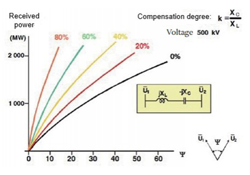 Este sistema de compensación serie se utiliza para incrementar la capacidad de transmisión. Si asumimos hipotéticamente que el grado de compensación es de 40~50%, la capacidad de transmisión puede mejorarse al menos en 30%.